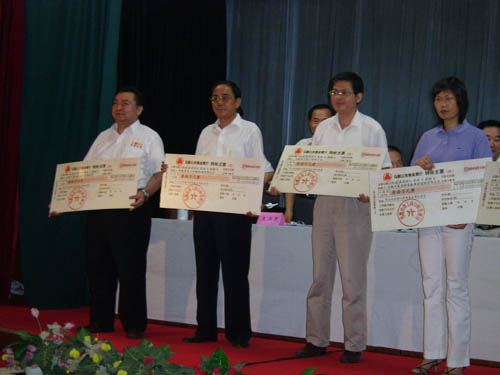 會(huì)議由市工商局局長(zhǎng)耿錦昌主持,市工商局副局長(zhǎng)羅耕寬通報(bào)了2005年全市商標(biāo)發(fā)展情況,省工商局 商標(biāo)局局長(zhǎng)劉國(guó)建宣讀了省工商局授予2005年省著名商標(biāo)企業(yè)的文件,市政府副秘書長(zhǎng)王興無(wú)宣讀了市政府對(duì)我公司等8家獲省著名商標(biāo)企業(yè)予以表彰的通報(bào),會(huì)議對(duì)獲獎(jiǎng)的8家企業(yè)授獎(jiǎng),給每個(gè)企業(yè)重獎(jiǎng)10萬(wàn)元 。會(huì)議聽(tīng)取了馬鋼、中德機(jī)床、洪濱絲畫等三企業(yè)代表的發(fā)言,最后,省工商局副局長(zhǎng)黃家華、市政府副市長(zhǎng)劉榮華均發(fā)表了重要講話,希望受表彰的企業(yè)銳意進(jìn)取,再接再厲,不斷加強(qiáng)企業(yè)的產(chǎn)品質(zhì)量和誠(chéng)信 建設(shè),進(jìn)一步做好商標(biāo)使用和推廣工作,促進(jìn)企業(yè)加快發(fā)展。各相關(guān)部門和單位要進(jìn)一步加強(qiáng)商標(biāo)管理工 作,鼓勵(lì)我市更多的企業(yè)爭(zhēng)創(chuàng)省著名商標(biāo)和中國(guó)馳名商標(biāo),為推進(jìn)我市東向發(fā)展,加快實(shí)現(xiàn)“兩個(gè)率先” 作出更大貢獻(xiàn)。