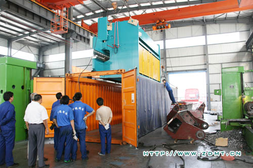 這套大型機(jī)床主機(jī)由兩臺250噸6米的數(shù)控板料折彎機(jī)組成,可實(shí)現(xiàn)單機(jī)及雙機(jī)聯(lián)動工作的功能,極大的方便了大型生產(chǎn)中的多元化要求。機(jī)器總重達(dá)50余噸,可完成12米的工件,對裝箱的操作技術(shù)要求很高,但由于我們機(jī)械化的車間及熟練的技術(shù)人員,裝箱過程雖然繁瑣但并不費(fèi)力。由于整機(jī)超高超長,采用的是兩個(gè)開頂箱,將兩臺主機(jī)分開來裝??紤]到機(jī)器要在海上航行近一個(gè)月,裝箱的工作人員做足了防護(hù)措施:底部鋼條固定,兩側(cè)鐵絲固定,外加透明塑料膜,頂部自制框架固定并套上雨布等等,以免在運(yùn)輸過程中造成對機(jī)器不必要的損壞。