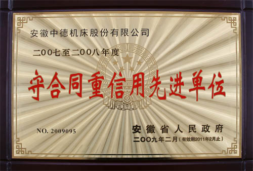 近日,我公司榮獲由安徽省人民政府頒發(fā)的二〇〇七至二〇〇八年度“守合同重信用先進(jìn)單位”榮譽(yù)稱號(證書號:2009095,有效期止2011年2月),也是我公司第二次獲得此項(xiàng)殊榮。