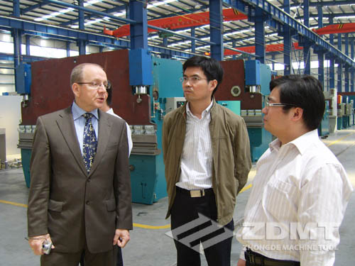 在整個的參觀過程里, EDWIN先生了解了我們先進的工廠全程監(jiān)控系統(tǒng),寬敞明亮的工作車間以及外形簡潔優(yōu)雅的產品。相信在韓總流暢的英文翻譯下,EDWIN先生一行對本地區(qū)剪折行業(yè)的發(fā)展?jié)摿σ欢ㄓ辛诵碌恼J識。同時,我們很感謝韓總和EDWIN先生,他們站在一個全新的角度,對中德機床提出了建設性的建議。我們也希望中德機床精益求精,同ESTUN公司和DELEM產品建立更緊密的關系,將中德機床推向更廣闊的市場。