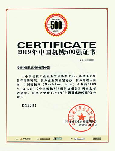 由中國機(jī)械工業(yè)企業(yè)管理協(xié)會主辦,機(jī)械工業(yè)經(jīng)濟(jì)管理研究院、世界企業(yè)實(shí)驗(yàn)室協(xié)辦,世界經(jīng)理人周刊、中國機(jī)械網(wǎng)承辦的2009年(第七屆)《中國機(jī)械500強(qiáng)研究報(bào)告》調(diào)查活動公布,中德機(jī)床榮獲2009年“中國機(jī)械500強(qiáng)”。